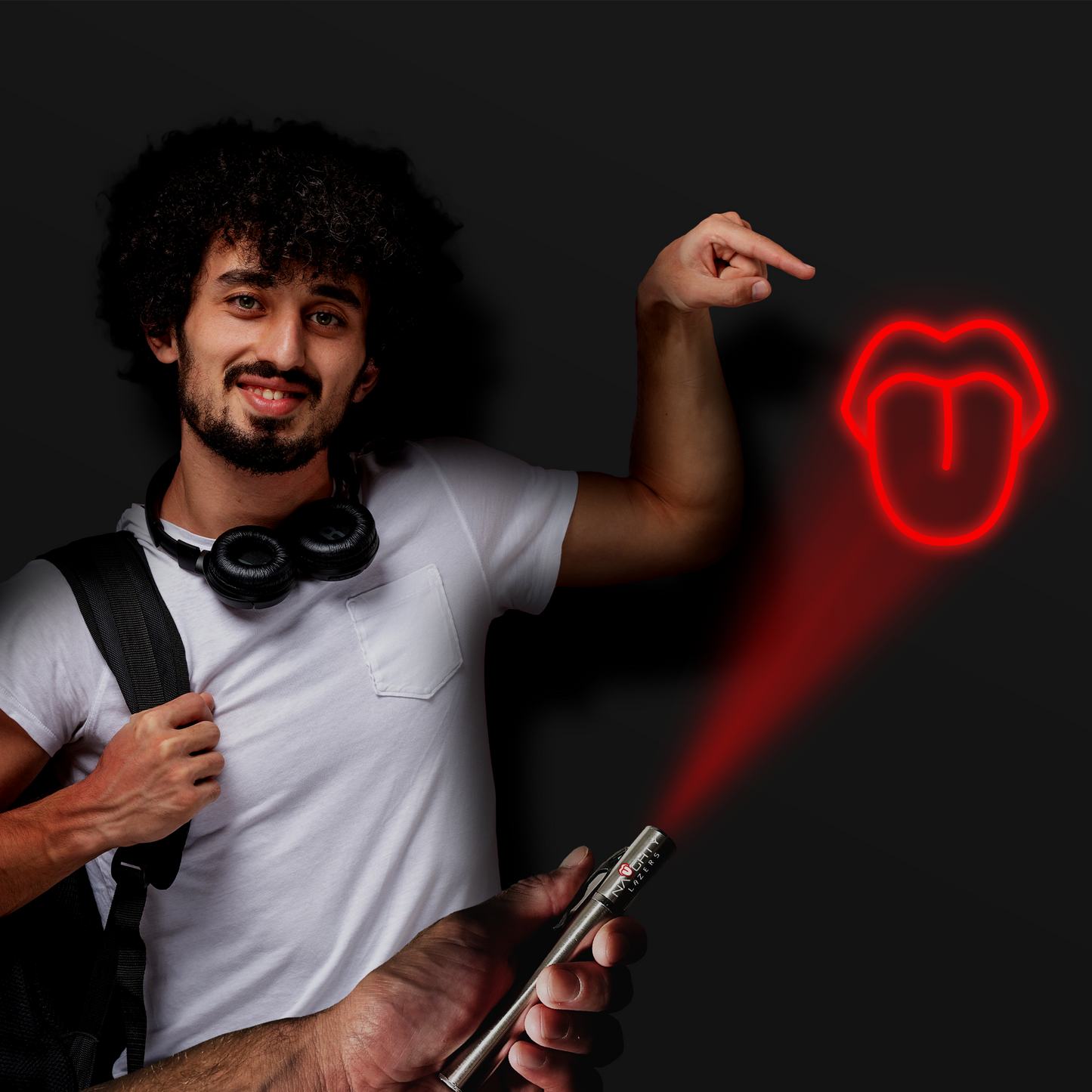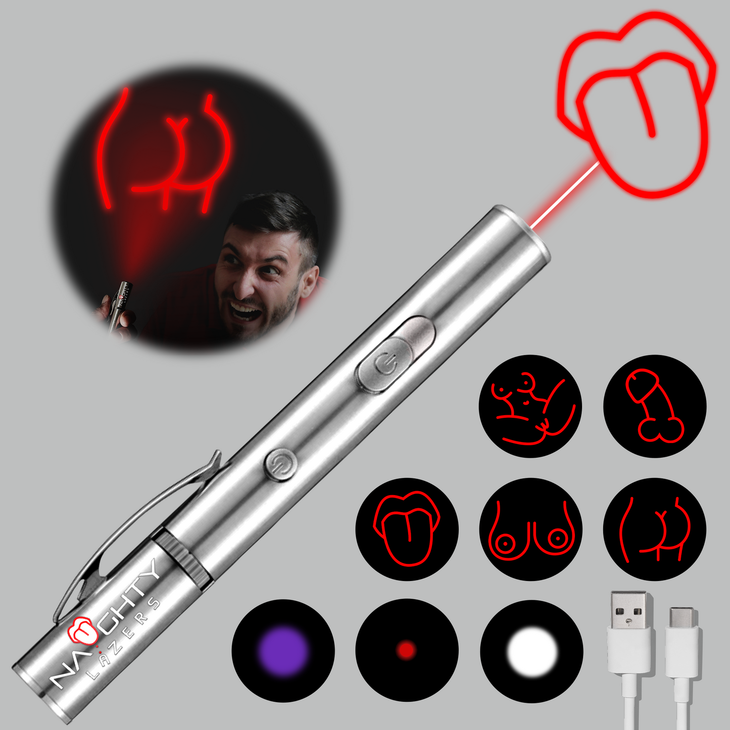 FEATURES: 5 hilarious naughty images, high-powered red dot laser (over 1000 ft. range), Flashlight, blacklight, USB charged. Lightweight - 1.4 oz